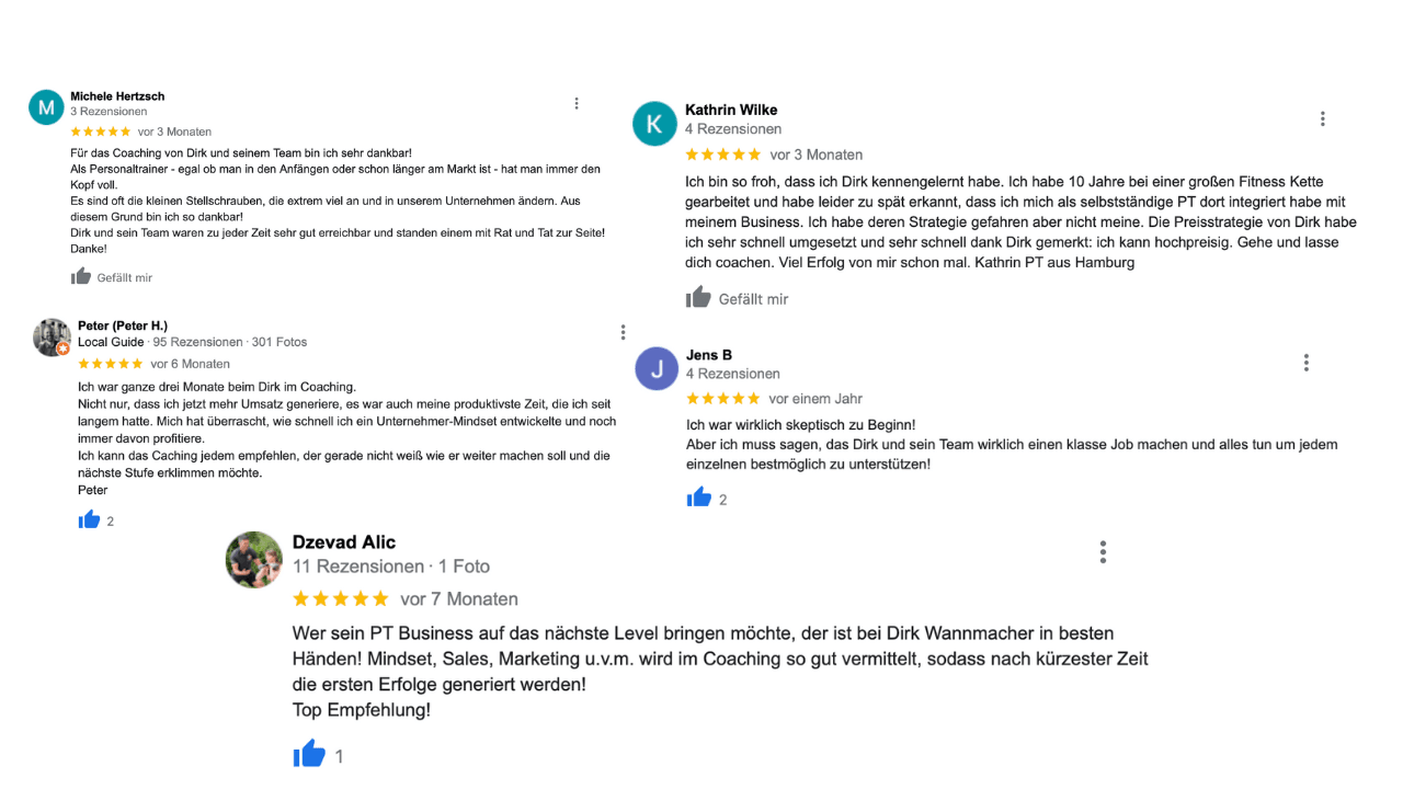 Ergebnis: Wir haben ihre komplette Ansicht über sich als PT und den Markt stark hinterfragt und geändert. So kommt sie jetzt dauerhaft an zahlungskräftige Neukunde und schließt diese auch zu sehr guten Stundensätzen von 120 Euro und mehr ab.